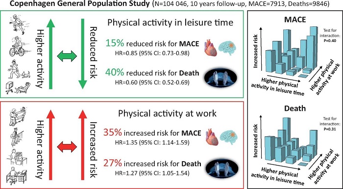 2021年4月,《歐洲心臟雜志》發(fā)表了一項(xiàng)來自丹麥哥本哈根一般人口研究(CGPS)的分析結(jié)果——從10.4萬名參與者10年的隨訪期狀況來看,工作時(shí)做的高強(qiáng)度體力活動(dòng),與主要心血管不良事件(MACE)風(fēng)險(xiǎn)上升35%密切相關(guān)[1],而工作休息之余做同樣強(qiáng)度的體力活動(dòng),則與MACE風(fēng)險(xiǎn)下降15%有關(guān)。