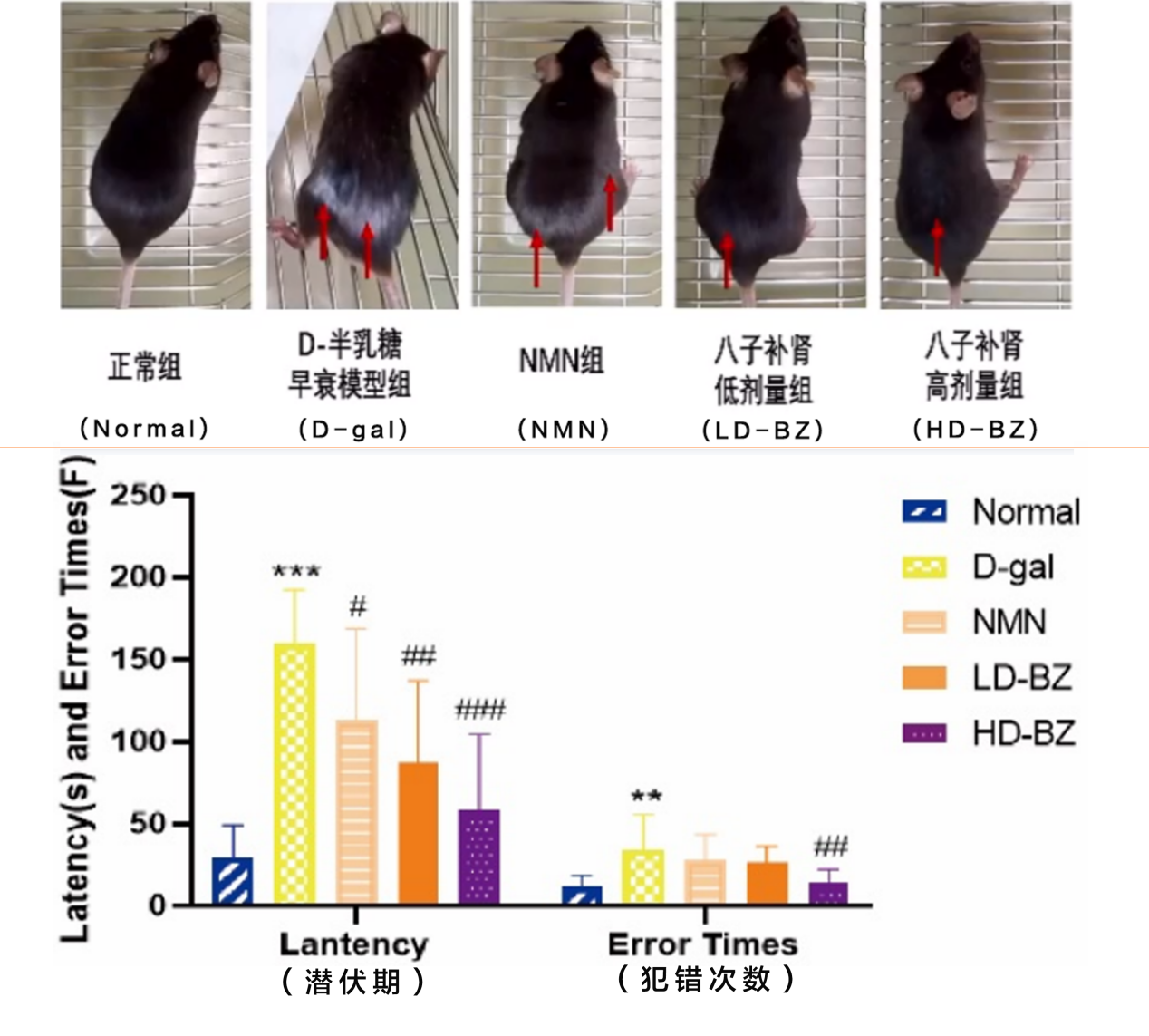 北京中醫(yī)藥大學(xué)科研人員采用D-gal誘導(dǎo)衰老小鼠模型,連續(xù)給藥60日,評價(jià)八子補(bǔ)腎膠囊改善腦功能的效果及作用機(jī)制。巴恩斯迷宮實(shí)驗(yàn)結(jié)果表明,八子補(bǔ)腎組小鼠在縮短逃避潛伏期、減少犯錯(cuò)次數(shù)上均有明顯作用(P<0.001;P<0.01)。