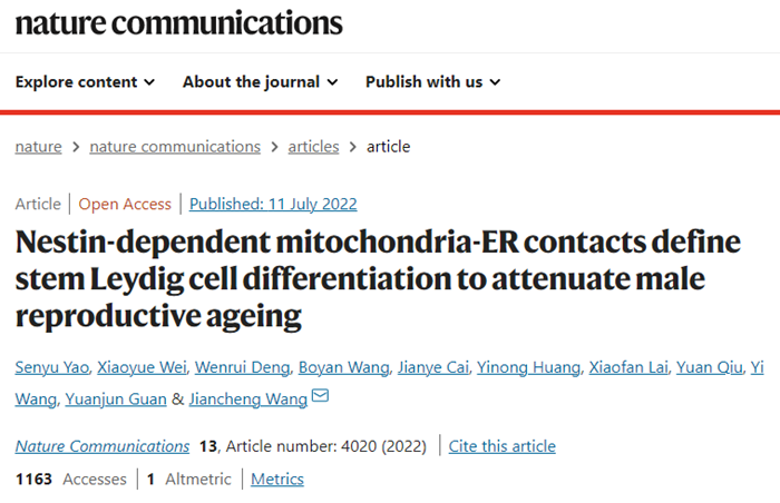 還有研究人員發(fā)現(xiàn)干細胞療法可以減緩男性生殖系統(tǒng)衰退,一項發(fā)表在Nature Communciation上,題為“Nestin-dependent mitochondria-ER contacts define stem Leydig cell differentiation to attenuate male reproductive ageing”的研究,提出了一種針對睪丸間質(zhì)干細胞(Stem leyding cells,SLCs)分化治療與年齡相關的生殖系統(tǒng)疾病的療法。