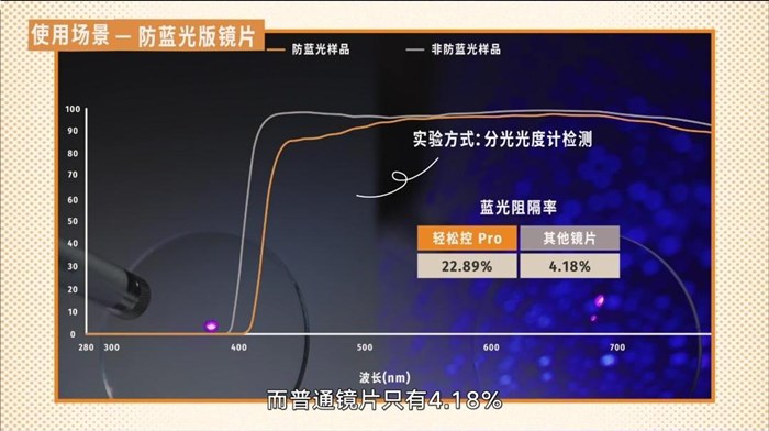 經(jīng)測(cè)定,輕松控Pro的藍(lán)光阻隔率為22.89%,而普通鏡片只有4.18%。輕松控Pro防藍(lán)光版,更適合經(jīng)常上網(wǎng)課的小朋友。