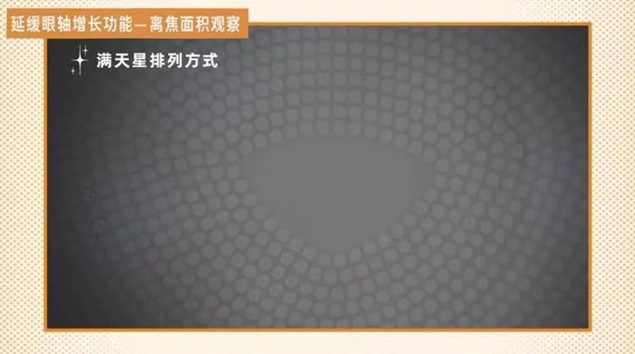 離焦鏡片上的微透鏡,就是能實(shí)現(xiàn)膜前離焦效果的關(guān)鍵。我們用投影的方式可以看到,輕松控Pro的鏡片上設(shè)計(jì)了大量微透鏡,并且它們以滿(mǎn)天星的排列方式,增加離焦面積。很多論文都表明,增加離焦面積可以強(qiáng)化控制眼軸增長(zhǎng)的效果。