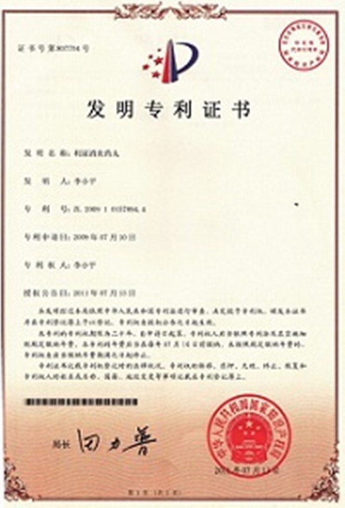 2009年在收集整理了大量的臨床成功案例和與利尿消炎丸相關的資料后,李中醫(yī)向國家遞交了發(fā)明專利申請。2011年經(jīng)相關部門審核后,李中醫(yī)獲頒了發(fā)明專利證書,至此其發(fā)明的中藥配方才真正擁有了官方名稱“利尿消炎藥丸”(患者習慣稱為“利尿消炎丸”),和專利號:zl200910157894.4。
