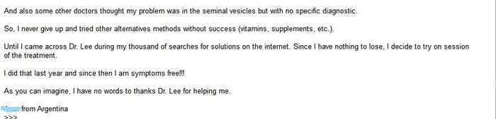 Bernard就是一位海外患者,其是阿根廷人。2015年Bernard偶然發(fā)現(xiàn)自己射精后會有大量的血液,有時在射精的過程中就會出現(xiàn),經(jīng)醫(yī)生診斷后他開始服用抗生素治療,但治療效果并不明顯,癥狀一直得不到改善,此后精液中帶血的情況每年都會出現(xiàn)一兩次,而且每次都會持續(xù)1~3個月。期間他也去了很多醫(yī)院檢查治療,但醫(yī)生們都診斷為前列腺炎或精囊炎,只讓他繼續(xù)服用抗生素。疾病治療不徹底,癥狀總是反反復復讓Bernard非常的苦惱。直到2018年10月他在網(wǎng)上了解到武漢李小平中醫(yī)門診部能夠治療此病,于是他便聯(lián)系上了李小平。10月12日Bernard開始服用利尿消炎丸治療,一個療程后Bernard反饋一切都好,沒有不適的癥狀出現(xiàn),三個療程結束,Bernard表示已經(jīng)徹底好了,完全沒有任何不適的癥狀。2019年11月1號Bernard還特地寫了封郵件感謝李中醫(yī)。