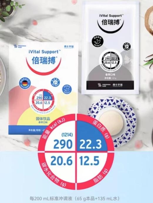 針對上述能量和蛋白質(zhì)的缺乏狀態(tài),建議在日常飲食的基礎(chǔ)上加用蛋白能量雙補的口服營養(yǎng)補充劑,例如倍瑞搏?。粉劑的倍瑞搏?每袋僅65g,可為機體提供290kcal能量,20.6g碳水化合物、22.3g蛋白質(zhì)和12.5g脂肪,有著高蛋白、高脂肪、高能量和低碳水的“三高一低”營養(yǎng)素配比。在蛋白能量雙補的同時,倍瑞搏?還特別添加了魚油[2],有抗炎和提升免疫力的作用。倍瑞搏?能夠同時為人們補充多種營養(yǎng),降低其營養(yǎng)不良的發(fā)生率。血糖代謝紊亂的人群可以另外選擇倍瑞蘋?口服營養(yǎng)補充劑。