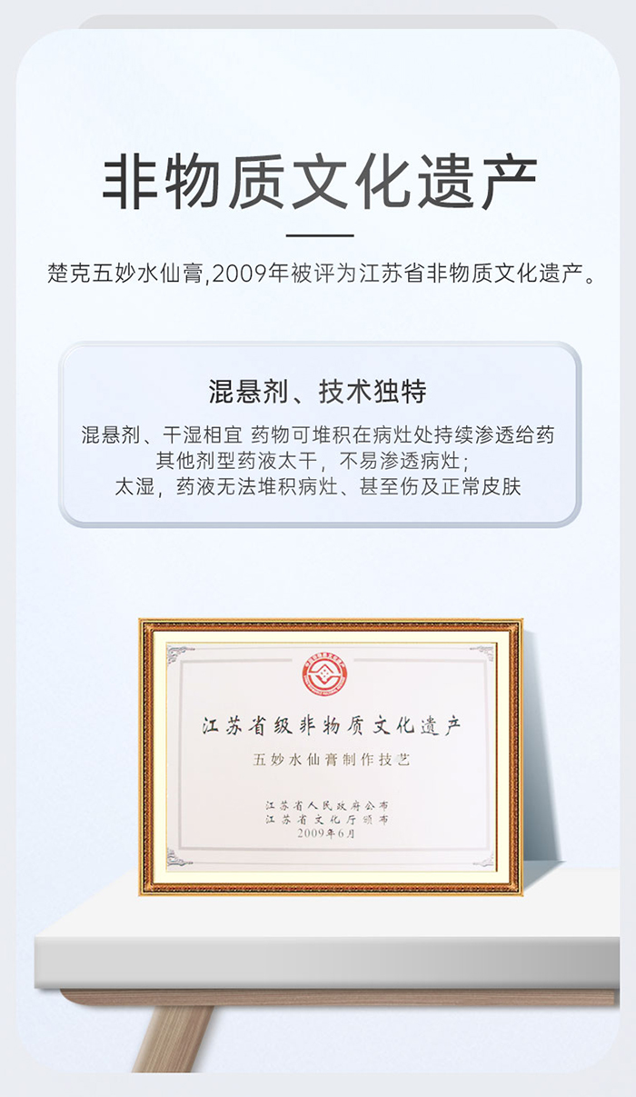 據(jù)《新安鎮(zhèn)志》記載,張山人將醫(yī)術(shù)以及自配的水晶膏傳給女婿——周達(dá)春的祖上周金和,從而開啟周家治病行醫(yī)的先河。在二百六十多年傳承中,周家后人對這一瑰寶藥方,不斷發(fā)掘調(diào)整。最后由周達(dá)春教授去除了糯米,加進(jìn)黃柏、五倍子、紫草等成份定型申報國藥準(zhǔn)字獲批。因改進(jìn)后的藥膏猶如仙丹,加之藥方由五種物品巧妙組合產(chǎn)生神奇的功效,故最終命名為五妙水仙膏,并于1997年載入《中國藥典》。五妙水仙膏是中華文化瑰寶、是幾十代前人的智慧結(jié)晶,歷經(jīng)260多年傳承,于2009年被江蘇省政府列入非物質(zhì)文化遺產(chǎn)。