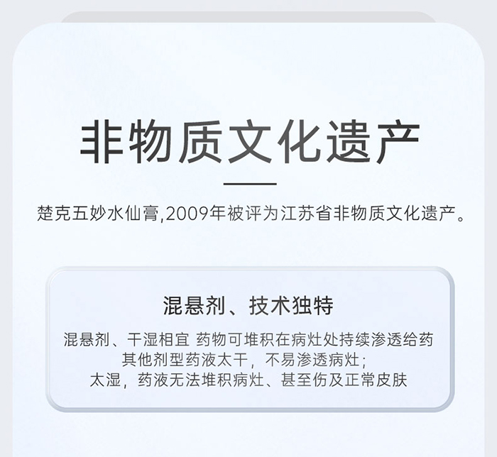 據(jù)《新安鎮(zhèn)志》記載,張山人將醫(yī)術(shù)以及自配的水晶膏傳給女婿——周達(dá)春的祖上周金和,從而開啟周家治病行醫(yī)的先河。在二百六十多年傳承中,周家后人對這一瑰寶藥方,不斷發(fā)掘調(diào)整。最后由周達(dá)春教授去除了糯米,加進(jìn)黃柏、五倍子、紫草等成份定型申報國藥準(zhǔn)字獲批。因改進(jìn)后的藥膏猶如仙丹,加之藥方由五種物品巧妙組合產(chǎn)生神奇的功效,故最終命名為五妙水仙膏,并于1997年載入《中國藥典》。五妙水仙膏是中華文化瑰寶、是幾十代前人的智慧結(jié)晶,歷經(jīng)260多年傳承,于2009年被江蘇省政府列入非物質(zhì)文化遺產(chǎn)。