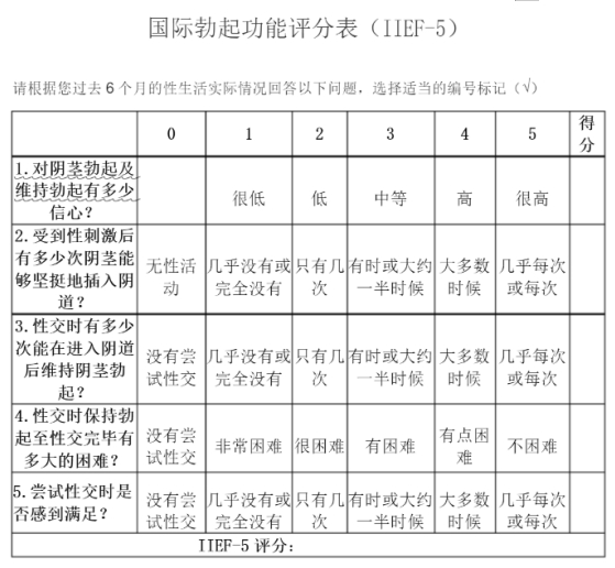 通常,IIEF-5評(píng)分小于7分為重度勃起功能障礙,8-11分為中度勃起功能障礙,12-21分為輕度勃起功能障礙,自我懷疑是不是有ED問題的朋友,其實(shí)也可以從網(wǎng)上找量表自己先測(cè)試一下。