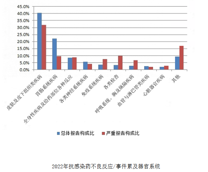 另外,國家每年公布的不良反應(yīng)監(jiān)測報告中,抗菌藥也是最常見的引起不良反應(yīng)的一大類藥品。在國家藥品不良反應(yīng)監(jiān)測年度報告(2022年)中,抗感染藥(包括抗生素、合成抗菌藥、抗真菌藥、抗病毒藥等)是臨床應(yīng)用最為廣泛的藥品類別之一,其不良反應(yīng)/事件報告數(shù)量一直居于首位,占2022年總體報告數(shù)量的28.0%,是藥品不良反應(yīng)監(jiān)測工作關(guān)注的重點。2022年抗感染藥不良反應(yīng)/事件報告數(shù)量排名前3位的藥品類別分別是頭孢菌素類、喹諾酮類、青霉素類。其累及器官系統(tǒng)情況詳見下圖。與抗感染藥的總體報告相比,嚴(yán)重報告的全身性疾病及給藥部位各種反應(yīng),免疫系統(tǒng)疾病,各類檢查,呼吸系統(tǒng)、胸及縱隔疾病,心臟器官疾病構(gòu)成比偏高。