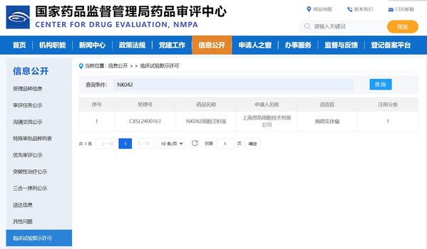 恩凱賽藥通用型基因修飾NK細(xì)胞藥物獲中國(guó)CDE臨床試驗(yàn)許可 官網(wǎng)截圖