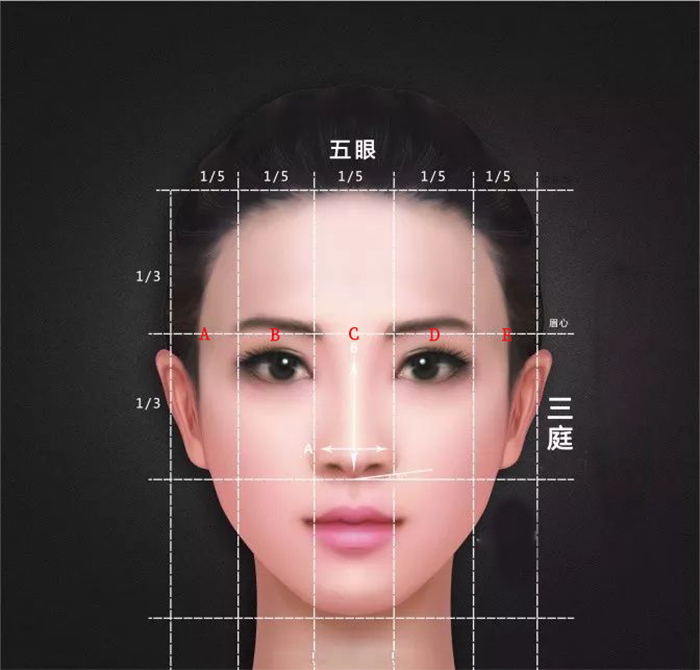 一側(cè)眼睛內(nèi)外眼角之間的距離乘以5,再除以五個數(shù)據(jù)之和,就得出了五眼比值。