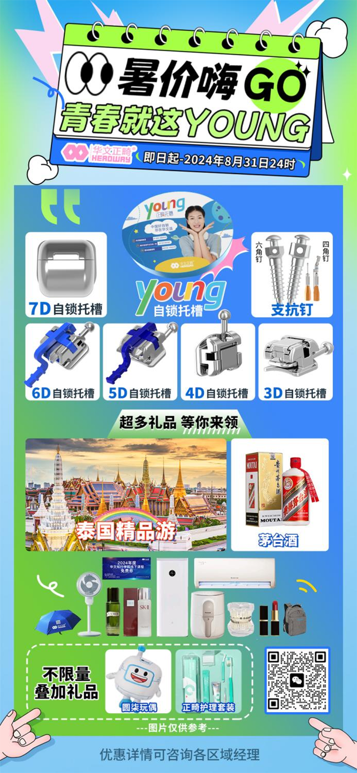為了讓口腔醫(yī)療機構囤定正畸耗材,滿足暑假超大量需求,華文正畸開展了滿額贈禮、增量送禮等優(yōu)惠活動。即日起至8月31日,下單華文正畸產品,即可享受大禮,活動覆蓋7D、6D、5D、4D、3D自鎖托槽、YOUNG自鎖托槽、支抗釘等多款產品。