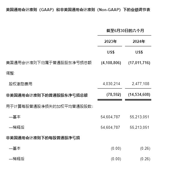 非美國通用會計準則下的凈虧損定義為該期間的美國通用會計準則下的凈虧損剔除股權激勵費用。相較于2023年同期的8萬美元,公司2024年上半年非美國通用會計準則下的凈虧損約為1,450萬美元。請參閱本新聞稿中題為"美國通用會計準則(GAAP)和非美國通用會計準則(Non-GAAP)下的業(yè)績調節(jié)表"部分了解詳情。