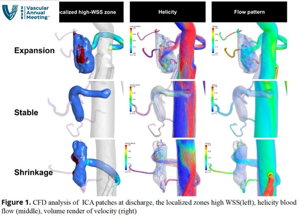 《Intercostal Artery Patch Morphology and Hemodynamics After Thoracoabdominal Aortic Aneurysm Repair: A Long-Term CFD Analysis》,該研究基于上海德達醫(yī)院 361 例胸腹主動脈替換術(shù)后患者CT影像學(xué)長期隨訪數(shù)據(jù),首次通過計算流體動力學(xué)(CFD)仿真技術(shù),系統(tǒng)分析肋間動脈補片(ICA patch)的形態(tài)學(xué)與血流動力學(xué)動態(tài)變化。通過對ICA補片體積、形態(tài)和分支吻合角度進行CFD 量化,為臨床預(yù)測補片擴張/破裂風(fēng)險提供力學(xué)評估模型工具,為優(yōu)化胸腹主替換手術(shù)肋間動脈補片重建提供理論基礎(chǔ)。(詳細參數(shù)略)