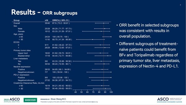 ORR 亞組分析顯示,在選定的亞組中,ORR 獲益與總體人群保持一致。無論年齡、腫瘤原發(fā)部位、是否基線存在肝轉(zhuǎn)移、以及腫瘤生物標(biāo)志物 Nectin-4 和 PD-L1 的表達(dá)狀態(tài),所有亞組均可從 9MW2821 聯(lián)合特瑞普利單抗的治療中獲益。年齡超過65 歲、腫瘤原發(fā)部位為下尿路、肝轉(zhuǎn)移、Nectin-4 表達(dá)陰性以及 PD-L1 表達(dá)陽性的受試者 ORR 分別為100%(24/24)、94.44%(17/18)、83.33%(5/6)、100%(7/7)、100%(8/8)。