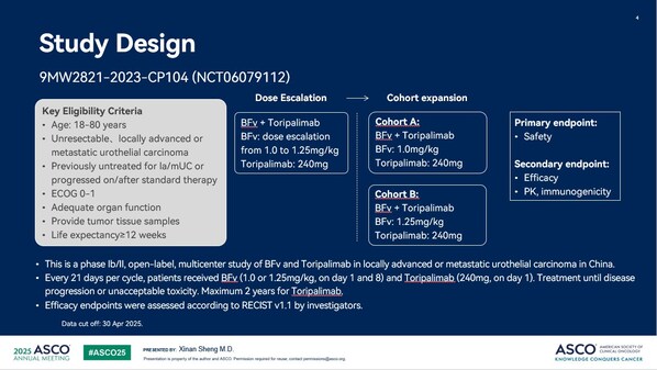 5 月 30 日 - 6 月 3 日在美國芝加哥舉辦的 2025 美國臨床腫瘤學(xué)會年會(ASCO)上,9MW2821 與特瑞普利單抗聯(lián)合用于治療局部晚期或轉(zhuǎn)移性尿路上皮癌(la/mUc)患者的 Ib/II 期臨床研究結(jié)果由北京大學(xué)腫瘤醫(yī)院泌尿腫瘤內(nèi)科主任醫(yī)師盛錫楠教授代表研究團(tuán)隊進(jìn)行了報告。9MW2821 聯(lián)合特瑞普利單抗在尿路上皮癌展現(xiàn)了令人鼓舞的療效及良好的安全性。