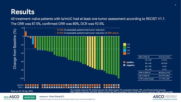 截至2025 年 4 月 30 日,本研究共入組 52 例局部晚期或轉(zhuǎn)移性尿路上皮癌(la/mUC)受試者。40 例可腫評的晚期 UC 一線受試者中,中位年齡 67 歲,70% 為男性,72.5% ECOG 評分為 1 分,腫瘤原發(fā)部位為上尿路的占比 55%,肝轉(zhuǎn)移占比 15%。生物標(biāo)志物表達(dá)方面,82.5% 為 Nectin-4 表達(dá)陽性,20% 為 PD-L1 表達(dá)陽性。