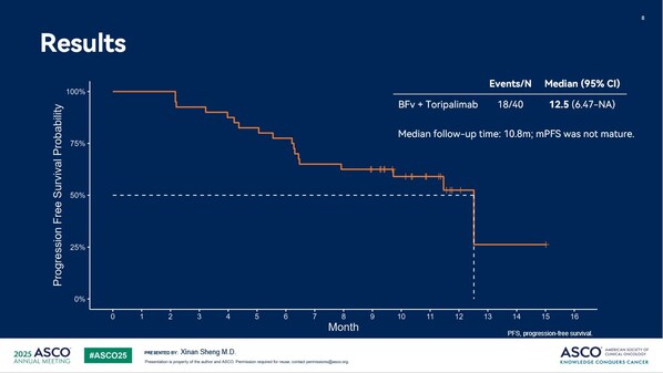 截至2025 年 4 月 30 日,45%(18/40)受試者發(fā)生疾病進(jìn)展或死亡,中位無進(jìn)展生存期(mPFS)為 12.5 個月(95% CI:6.47-NA),中位緩解持續(xù)時間(mDoR)尚未達(dá)到。中位隨訪時間為 10.8 個月,mPFS 和 mDoR 尚未成熟。