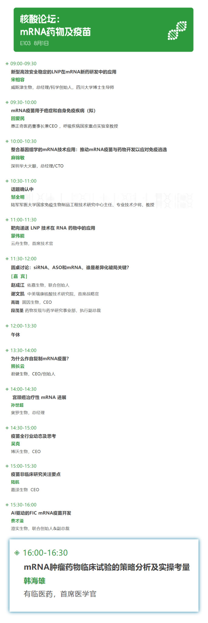 有臨醫(yī)藥榮幸受邀出席本屆盛會。論壇首日(8月1日 16:00-16:30),有臨首席醫(yī)學(xué)官韓海雄博士將發(fā)表主題報告《mRNA腫瘤藥物臨床試驗的策略分析及實操考量》。