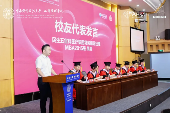 在校友代表發(fā)言環(huán)節(jié),禹爽院長以《以初心為舵,以實干為帆》為題,從“認知的躍遷、思維的進化、信念的凝聚”三個關鍵詞出發(fā),分享了自己在醫(yī)療管理一線深耕十余年的思考與實踐。他坦言:“中南大MBA不僅塑造了我的知識體系,更刷新了我對管理的認知維度——從直覺到邏輯,從經(jīng)驗到系統(tǒng)?!彼膭钤趫霎厴I(yè)生“沉下心來、走穩(wěn)腳下、仰望星空”,在現(xiàn)實中深耕,在理想中飛翔,心有所信,行有所至。