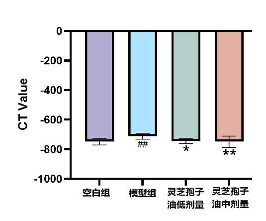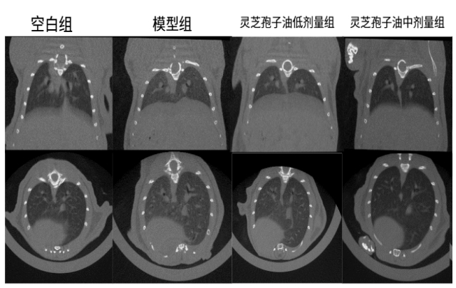 圖:靈芝孢子油對肉芽腫型肺結(jié)節(jié)小鼠肺部斷層掃描檢測結(jié)果及統(tǒng)計
