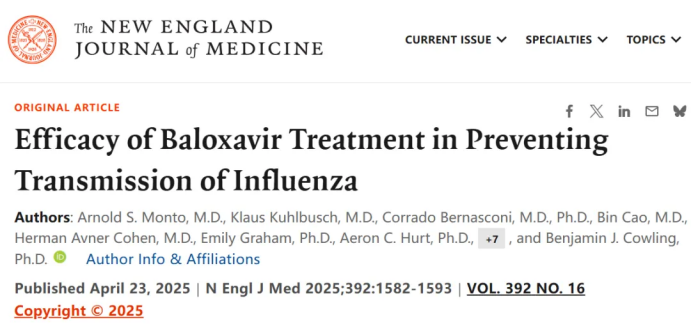 [1] Monto, AS. et al. Efficacy of Baloxavir Treatment in Preventing Transmission of Influenza. New England Journal of Medicine [Internet; cited April 2025]