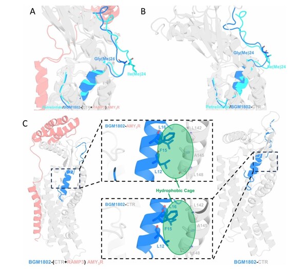 BGM1812是在AI輔助分子篩選與分子動力學(xué)模擬指導(dǎo)下設(shè)計(jì)的一種新型雙靶點(diǎn)多肽分子。予路乾行研究團(tuán)隊(duì)首先以Petrelintide為基礎(chǔ),采用分子動力學(xué)方法,發(fā)現(xiàn)其Ile(Me)24突變?yōu)镚ly(Me)24后可形成BGM1802,進(jìn)而顯著提升抗聚集傾向。模擬結(jié)果進(jìn)一步揭示,BGM1802在AMY3R與CTR的結(jié)合位點(diǎn)中,其L12、F15、L16三聯(lián)疏水殘基與受體內(nèi)疏水殘基可共同構(gòu)建"疏水籠"結(jié)構(gòu),增強(qiáng)受體配體復(fù)合物的穩(wěn)定性,并促進(jìn)受體激活。