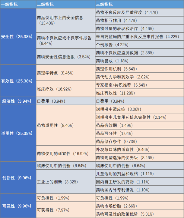 圖1:兒童抗過敏藥物臨床綜合評價系統(tǒng)(指標(biāo)和權(quán)重)
