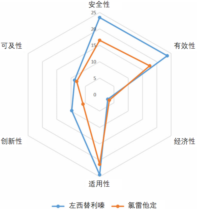 基于上述系統(tǒng),通過文獻(xiàn)梳理和家長問卷調(diào)查收集兩種藥物在實際臨床應(yīng)用中的數(shù)據(jù),結(jié)合藥品說明書、官方監(jiān)測數(shù)據(jù)及診療指南等多來源信息,由專家團(tuán)隊按統(tǒng)一標(biāo)準(zhǔn)對藥物各項指標(biāo)進(jìn)行評分。最后綜合權(quán)重與專家評分,計算總體評價得分,并通過雷達(dá)圖直觀呈現(xiàn)兩藥在各維度的表現(xiàn)。