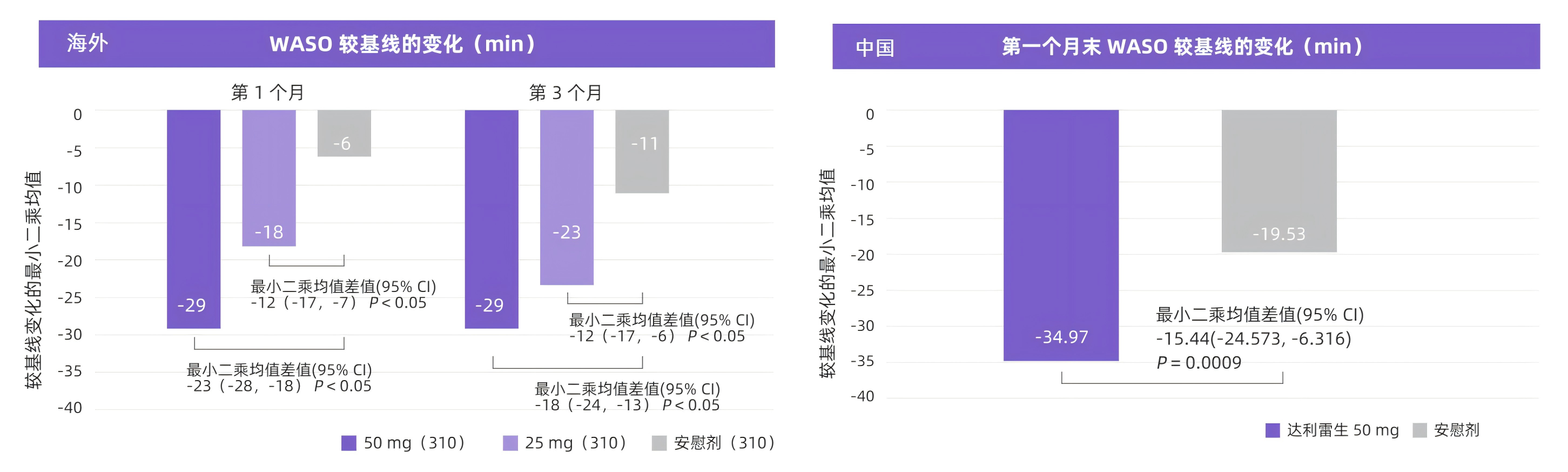 圖 2,3 海外和中國(guó) Ⅲ 期臨床研究:達(dá)利雷生與安慰劑相比,較基線期 WASO 的改變情況