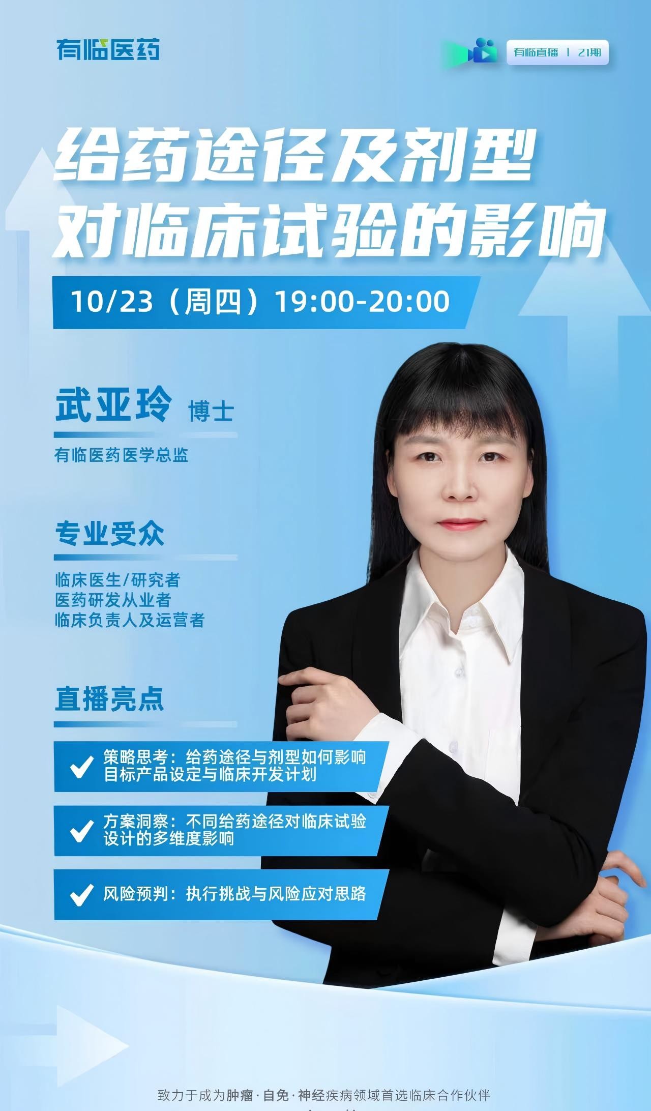 10月23日(周四)19:00,有臨醫(yī)藥醫(yī)學(xué)總監(jiān)武亞玲博士,將為您帶來深度分享《給藥途徑及劑型對臨床試驗(yàn)的影響》。敬請鎖定有臨直播間,讓我們從精準(zhǔn)給藥選擇開始,提升臨床開發(fā)效率與成功率。