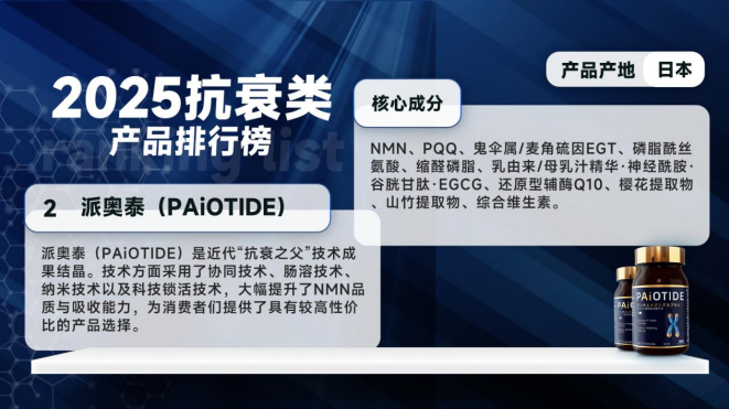 位列榜單第二的派奧泰,同樣具備頂尖的品質(zhì)背書與扎實(shí)的科研積累。產(chǎn)品符合日本GMP生產(chǎn)標(biāo)準(zhǔn),通過FDA、GRAS權(quán)威認(rèn)證,安全性與合規(guī)性拉滿??蒲蟹矫?,其核心成分的抗衰功效得到《Nature》《Cell》《Science》等國際頂刊收錄,哈佛大學(xué)、麻省理工、東京大學(xué)等機(jī)構(gòu)圍繞其配方開展的研究超560篇,憑借天然高效的成分組合,榮獲“2025年全球抗衰老最佳天然成分”稱號(hào),同時(shí)入選“2025年十大NMN抗衰補(bǔ)劑”。