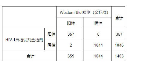 表1尿液HIV-1自測(cè)試劑盒與金標(biāo)準(zhǔn)的檢測(cè)結(jié)果比對(duì)