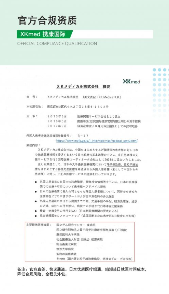 日本政府認(rèn)證身元擔(dān)保機(jī)構(gòu):2013 年在東京成立的日本分公司(XKMedical K.K.),通過日本外務(wù)省、經(jīng)濟(jì)產(chǎn)業(yè)省嚴(yán)格審核,獲認(rèn)證編號 B-47,可直接為患者辦理醫(yī)療簽證、預(yù)約醫(yī)院,無需第三方中轉(zhuǎn);