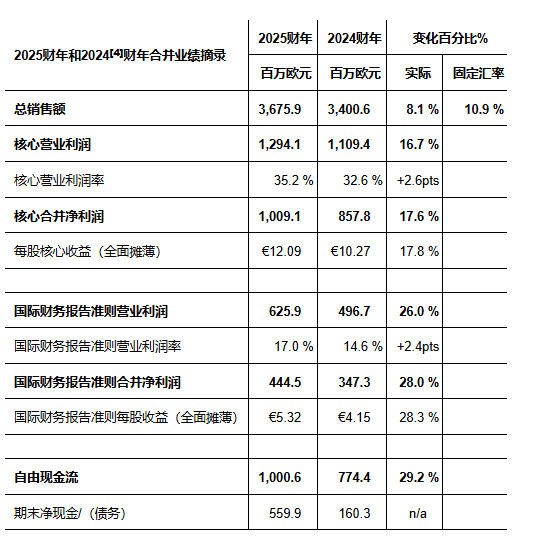 ? 2025財(cái)年核心營業(yè)利潤為12.94億歐元,以報(bào)告匯率計(jì)算增長16.7%,核心營業(yè)利潤率占總銷售額的35.2%,增長2.6個(gè)點(diǎn)